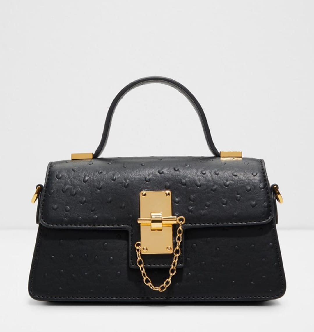 Step into elegance with the ALDO Black Top Handle Bag, featuring a sophisticated ostrich-texture finish and a statement gold lock with chain detail. Its structured design adds a touch of luxury, making it the perfect accessory for both day and evening looks. With a spacious interior and practical compartments, this bag combines functionality with timeless style.