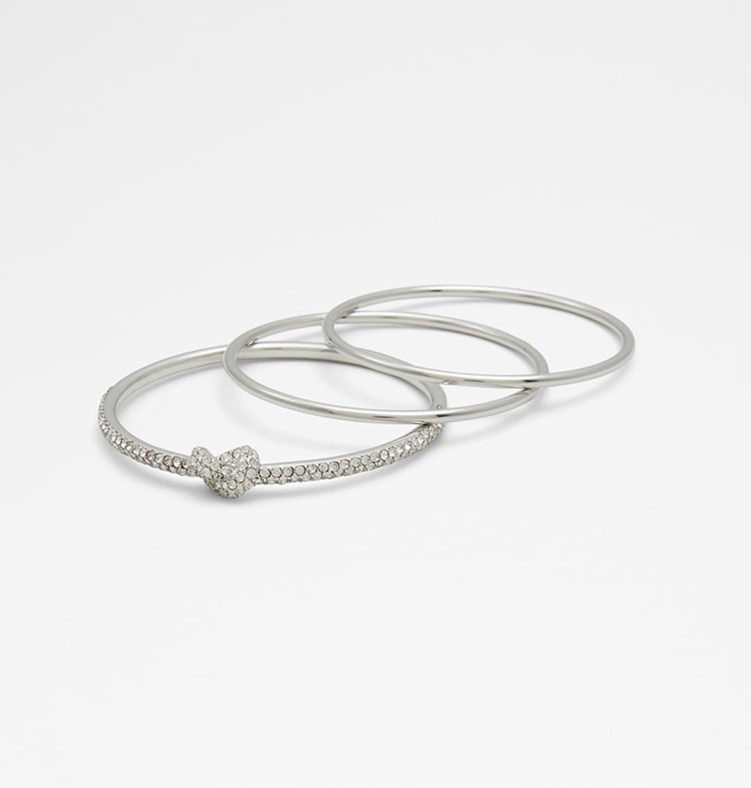 Elevate your everyday and occasion looks with the Aldo Silver Bangle Set. This elegant set includes three bangles, featuring two sleek minimalist designs and one encrusted with sparkling crystals and a knot centerpiece for that touch of glamour.