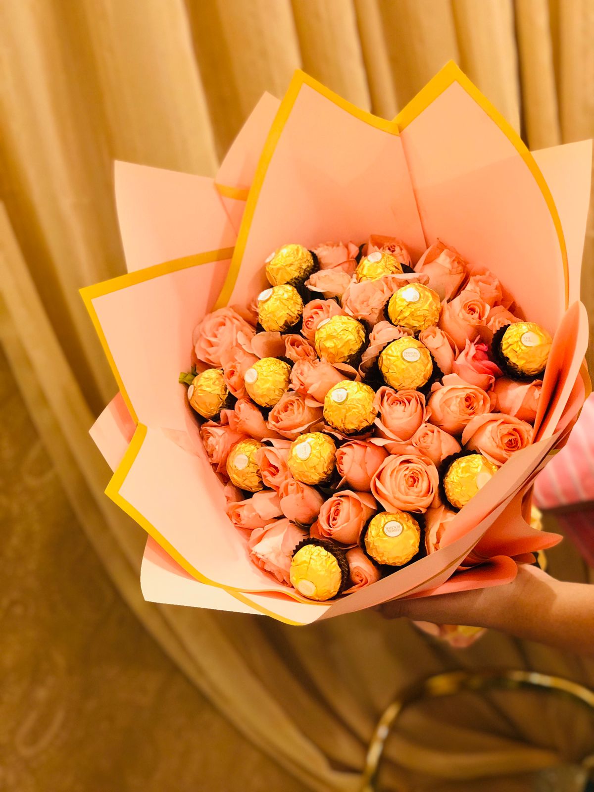 Indulge in elegance and romance with our Ferrero Rose Magic Bouquet, the perfect harmony of flowers and chocolates. This premium arrangement features around 30 fresh pink roses paired with 15 Ferrero Rocher chocolates, beautifully designed to express love, gratitude, or celebration.