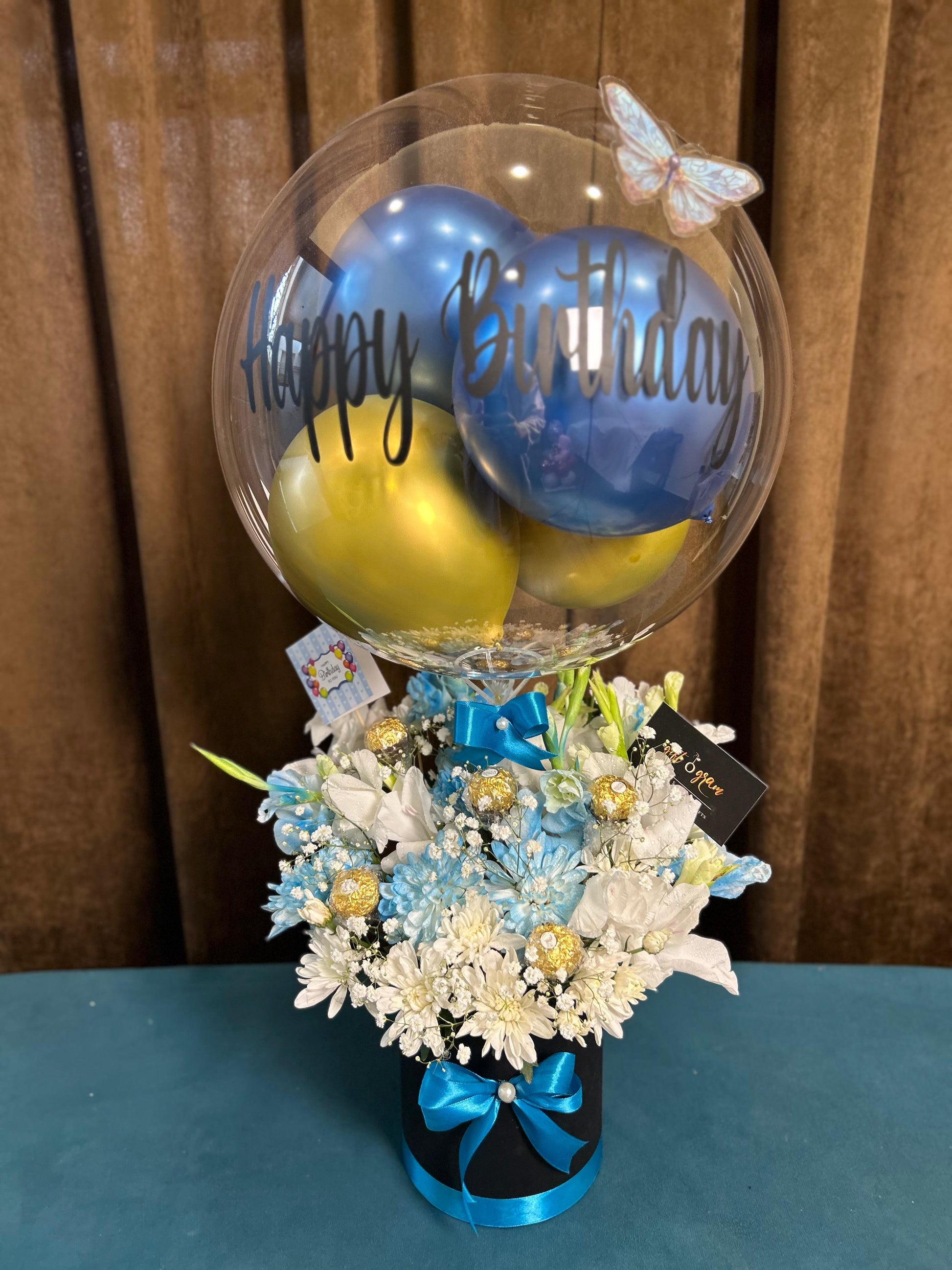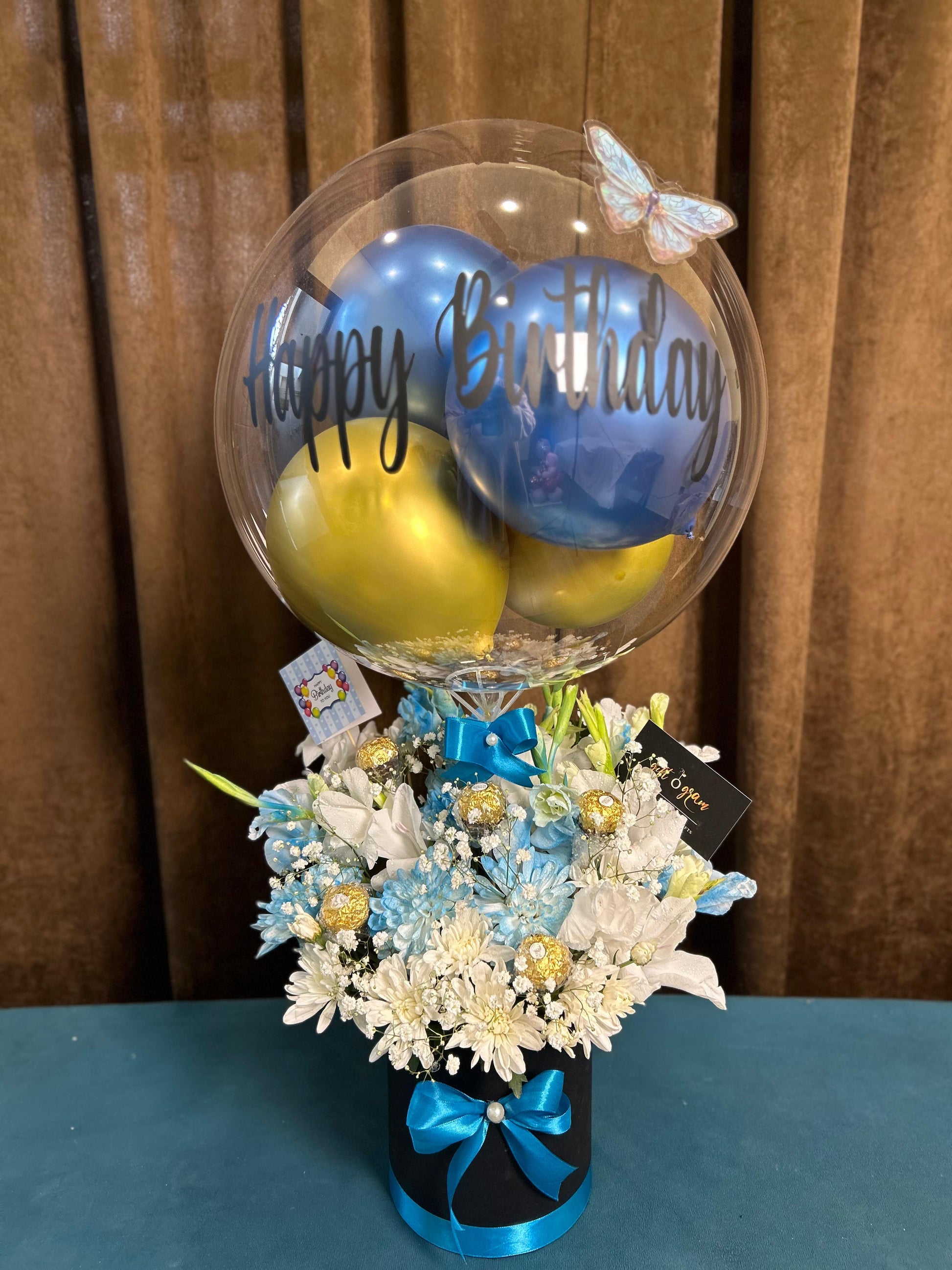 Surprise your loved ones with our Flower Balloon Box, a stunning luxury gift box designed to spread happiness on every occasion. This elegant gift is beautifully arranged with Fresh Flowers, Ferrero Rocher Chocolates and Customized Transparent Balloon.
