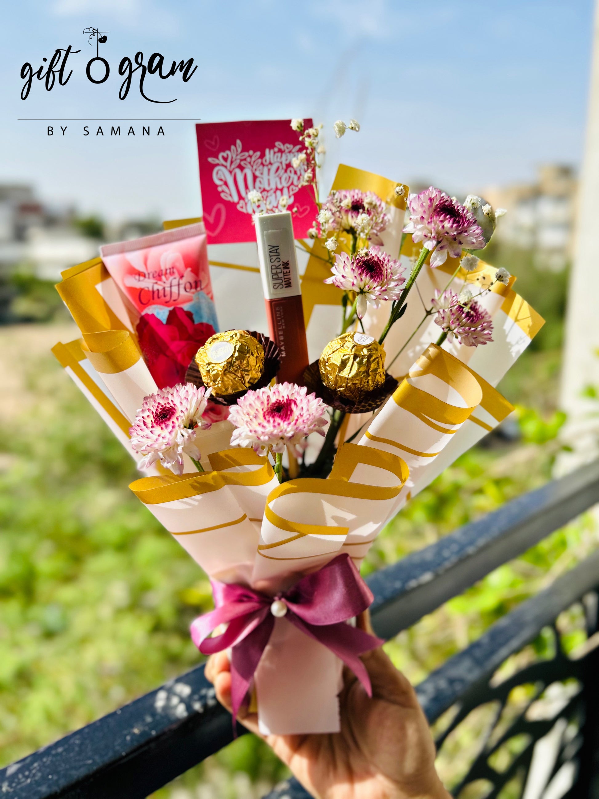 Love for Mom — A heartfelt gift set to make her day special. Featuring a beautiful flower bouquet, Maybelline lipstick, Dear Body hand cream, and two Ferrero Rocher chocolates — the perfect blend of beauty, care, and sweetness for the one who deserves it all.