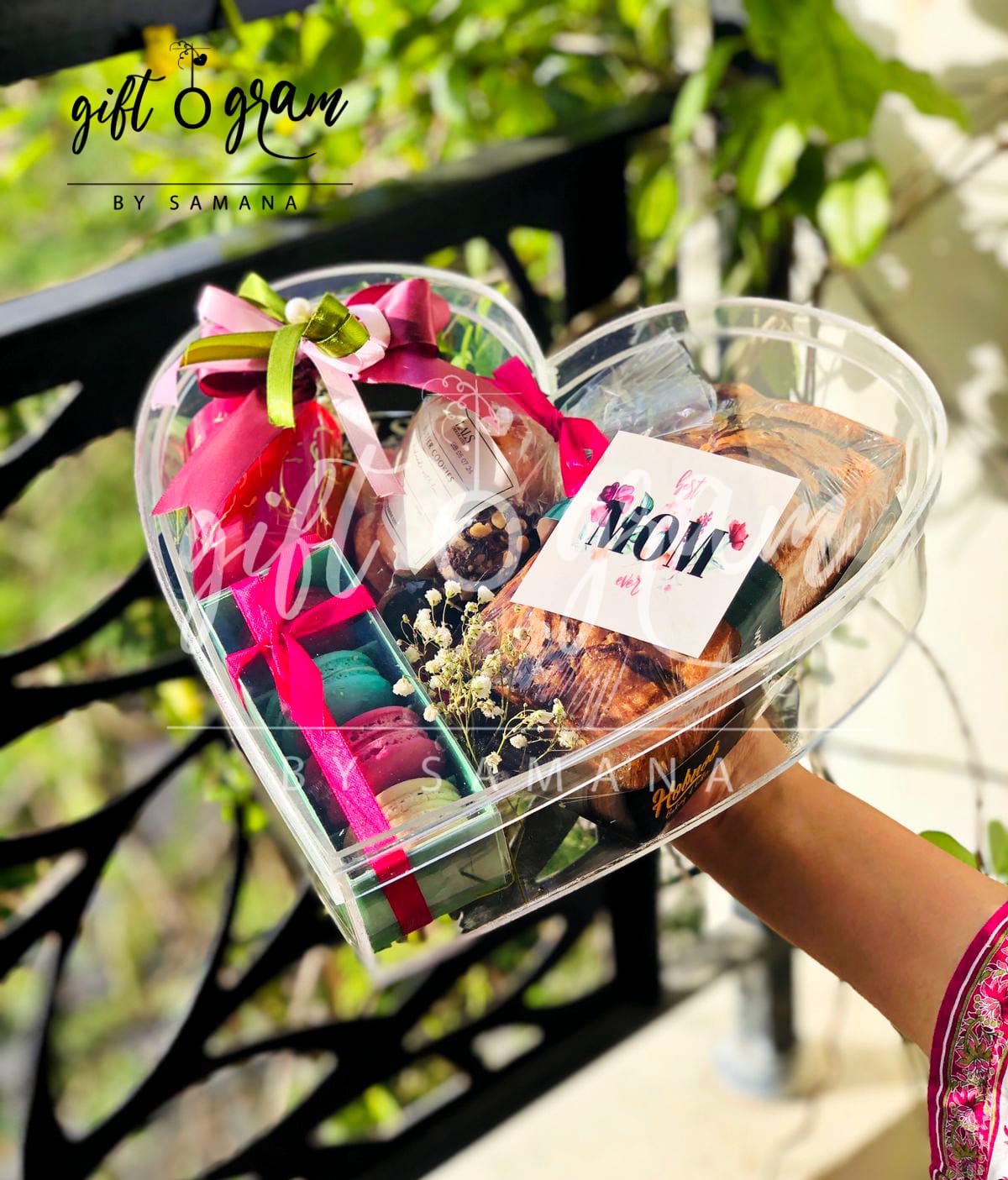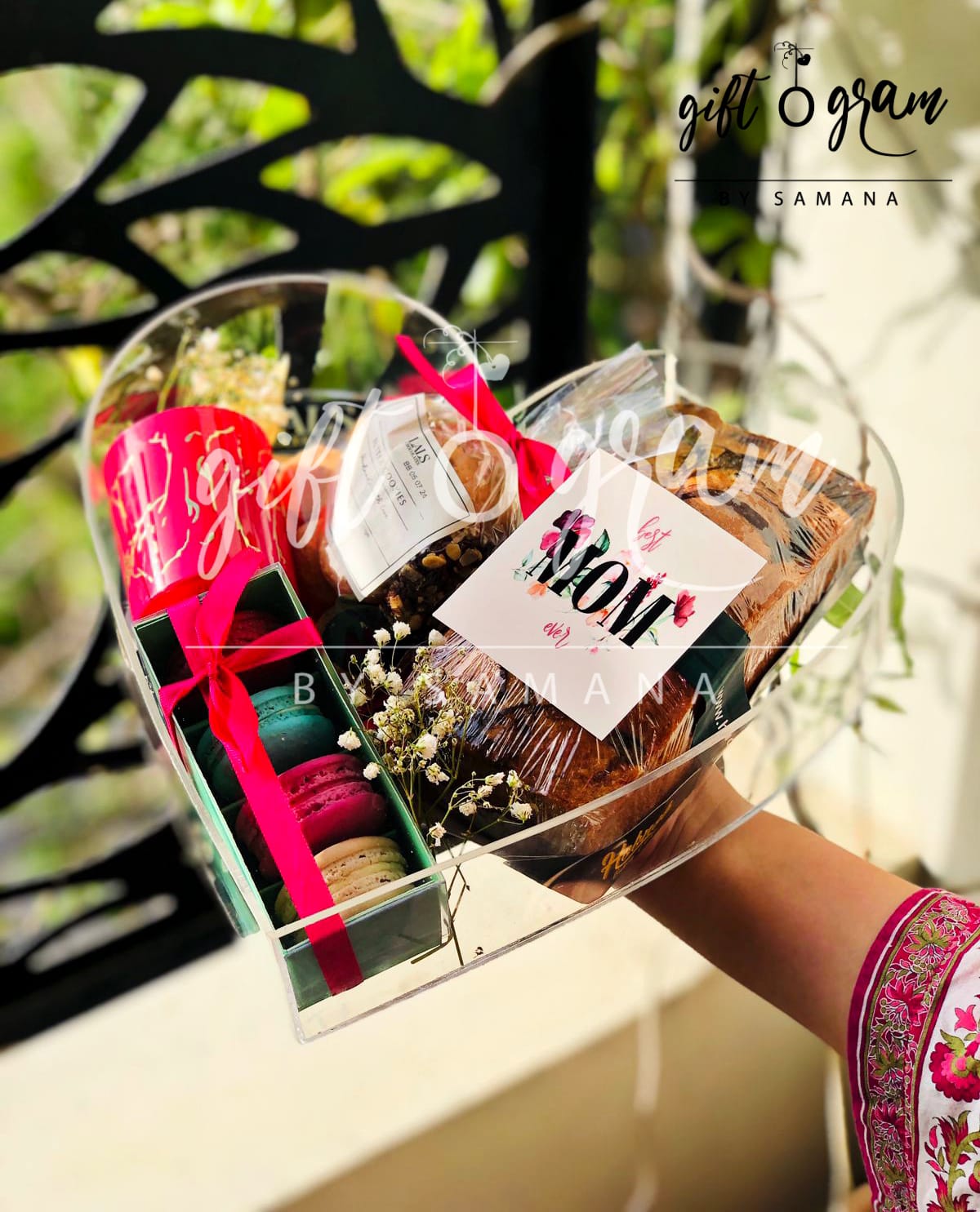 Make this Mother’s Day unforgettable with our Mother’s Day Package 6, presented in a beautiful customized acrylic heart box. This luxury hamper includes a marble cake, a Lindt/Ferrero chocolate bar, 4 pieces of macarons, a soothing scented candle, and a pack of butter cookies.