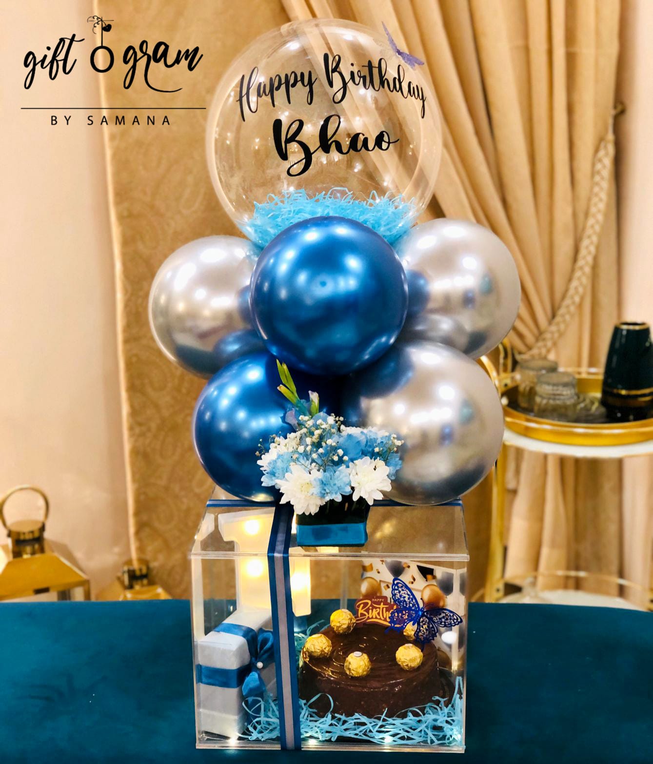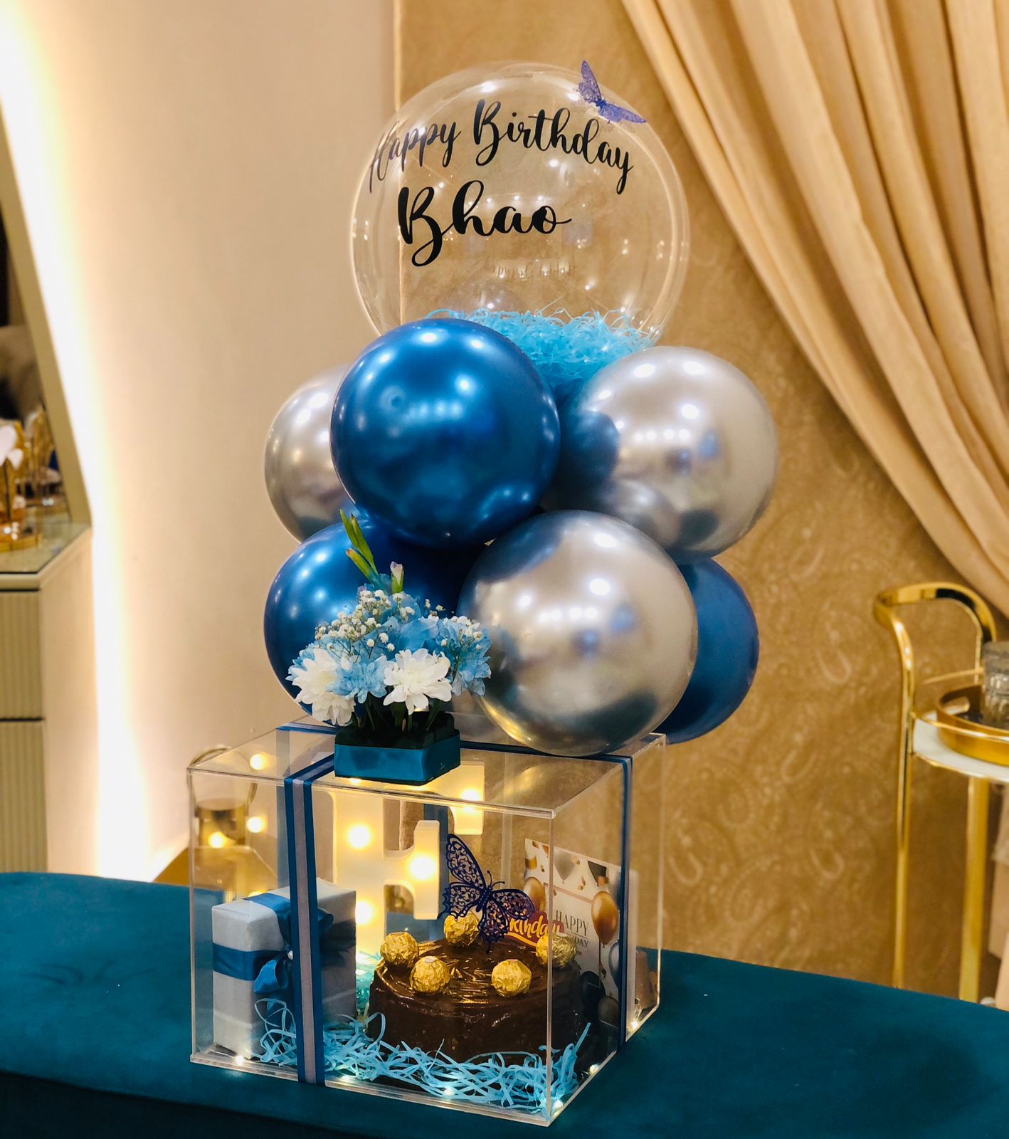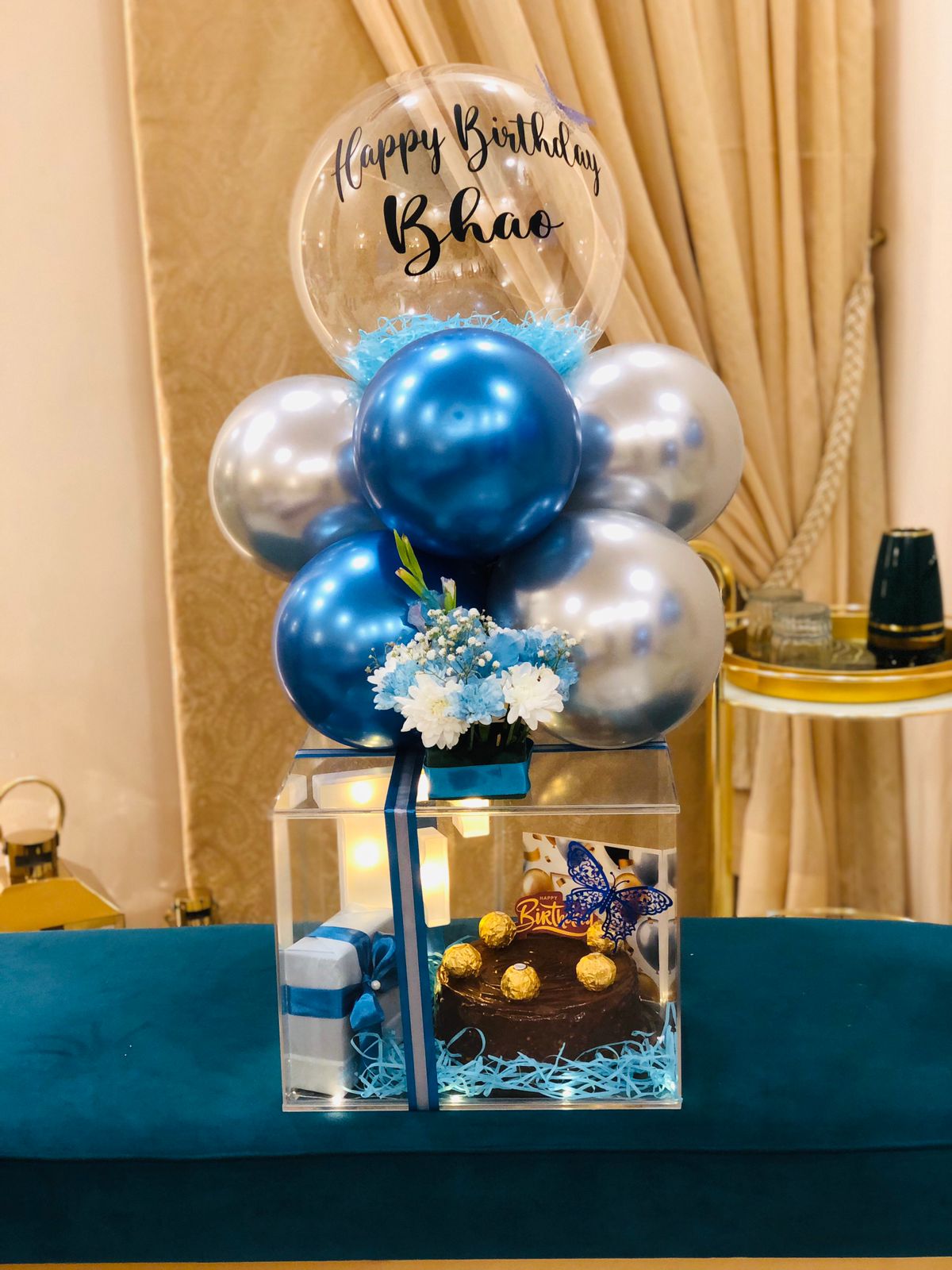 Celebrate life’s sweetest moments with our Scented Surprise Box, a luxury gift set designed to impress. This elegant acrylic box arrangement includes a rich 2.5 pounds cake from Kababjees or Delizia, a premium perfume from J., fresh and vibrant flower bunch, and a balloon bunch with customized balloon for a festive touch. Adding to the charm, it features a glowing LED alphabet and a heartfelt card, making it the perfect gift for birthdays, anniversaries, weddings, or just to surprise someone special.