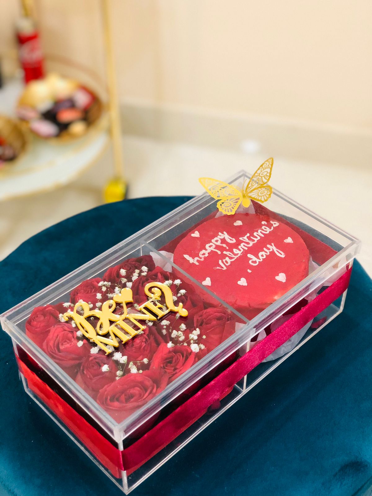 Celebrate love in style with our Sweetheart Showcase, a stunning acrylic box filled with fresh elegance and sweetness. This package includes fresh roses with baby breath flowers, a customized bento cake, and a chic acrylic topper – a perfect ensemble to elevate your Valentine’s Day or anniversary celebrations.