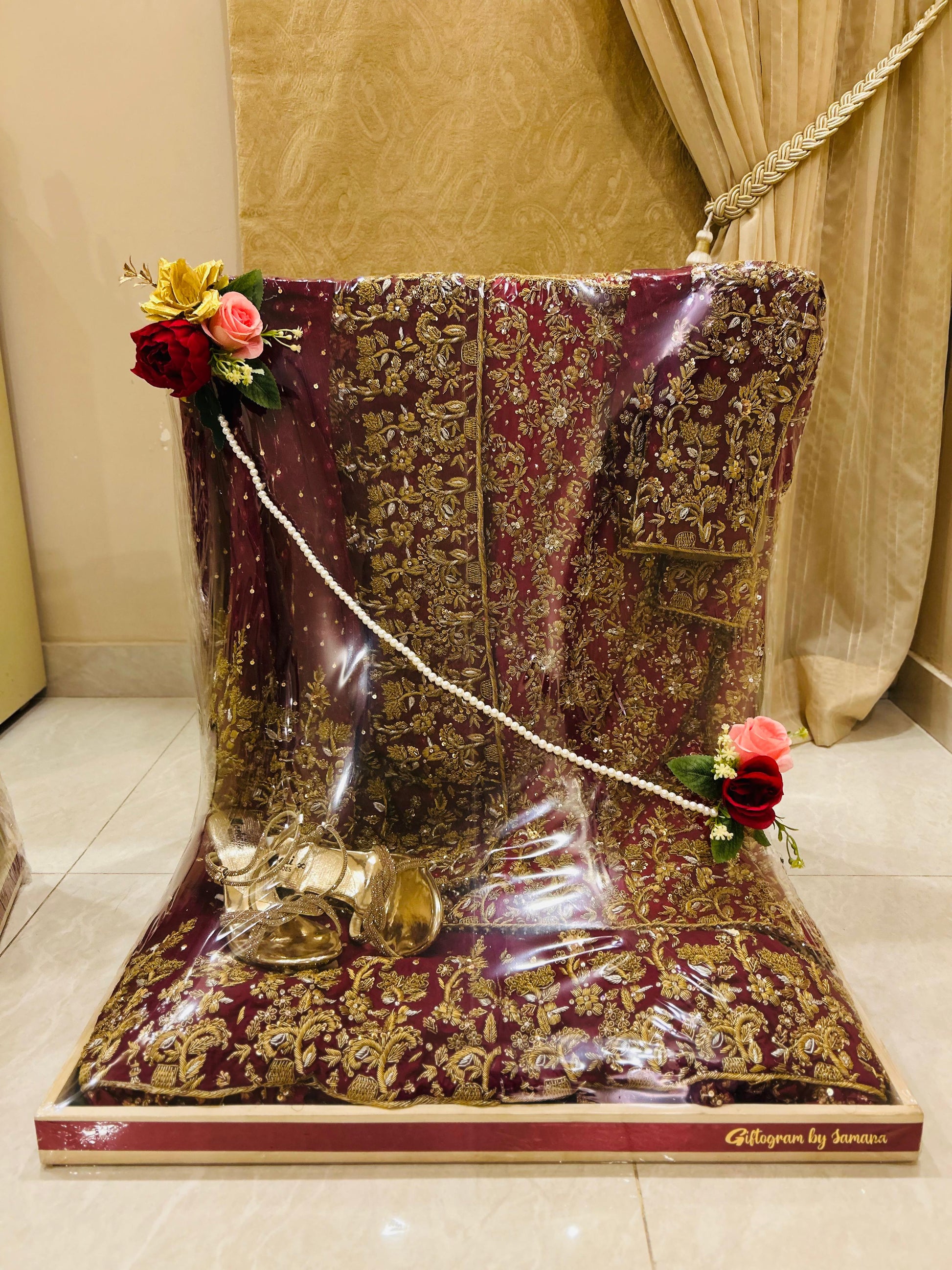Beautifully designed with a wooden base, decorative florals, and a hanging rod for displaying outfits, this packaging style is perfect for showcasing bridal dresses, groom outfits, jewellery, accessories, watches, perfumes, and wedding essentials.